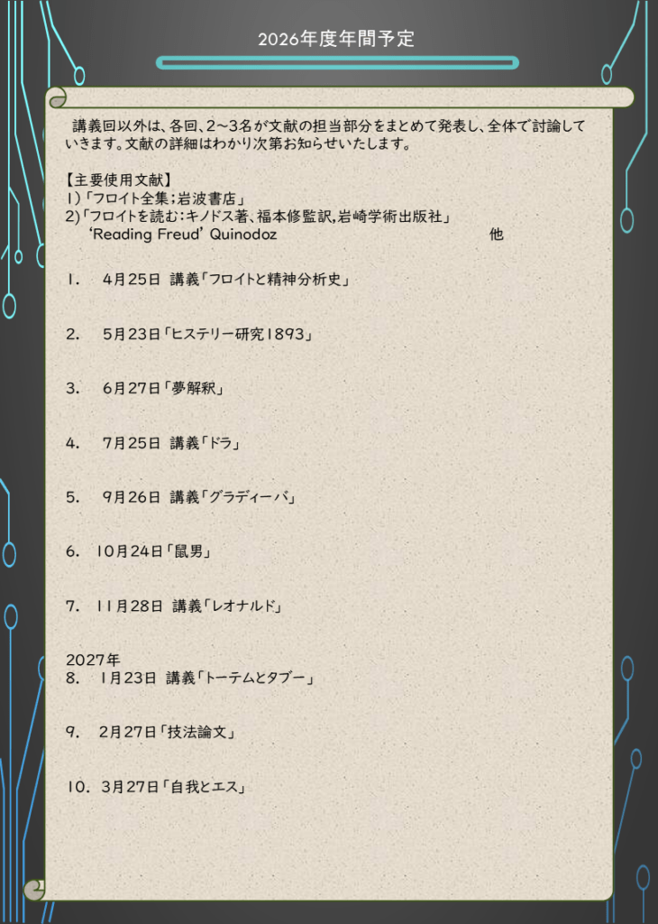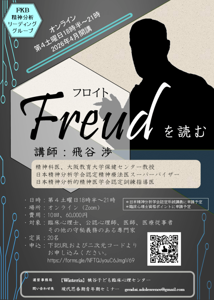 2026年4月より、飛谷渉先生を講師として、1年を通して文献購読セミナー「フロイトを読む」が開催されることになりました。